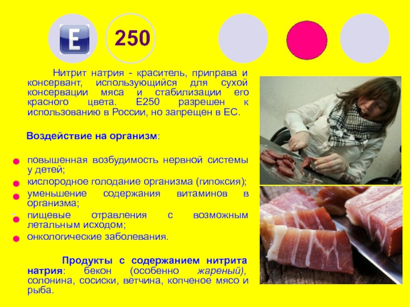 Нитрит натрия - краситель, приправа и консервант, использующийся для сухой консервации мяса и стабилизации его красного цвета. Е250 разрешен к использованию в России, но запрещен в ЕС.