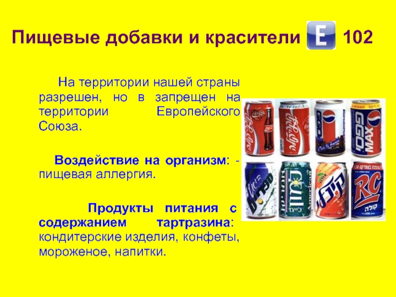 Продукты питания с содержанием тартразина: кондитерские изделия, конфеты, мороженое, напитки.
