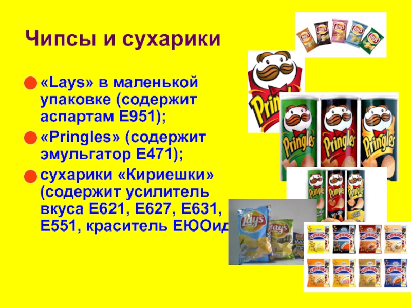 сухарики «Кириешки» (содержит усилитель вкуса Е621, Е627, Е631, Е551, краситель ЕЮОидр.).