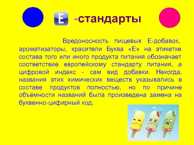 Вредоносность пищевых Е-добавок, ароматизаторы, красители Буква «Е» на этикетке состава того или иного продукта питания обозначает соответствие европейскому стандарту питания, а цифровой индекс - сам вид добавки. Некогда, названия этих химических веществ указывались в составе продуктов полностью, но по причине объёмности названий была произведена замена на буквенно-цифирный код.