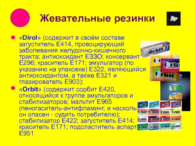 «Dirol» (содержит в своём составе загуститель Е414, провоцирующий заболевания желудочно-кишечного