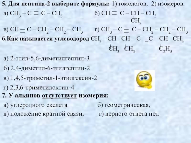 Слайд 125. Для пентина-2 выберите формулы: 1) гомологов; 2) изомеров.