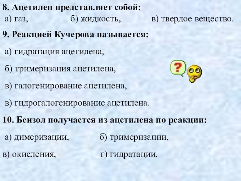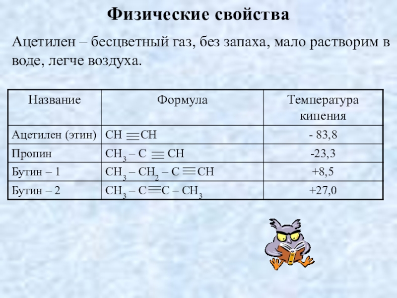 Ацетилен – бесцветный газ, без запаха, мало растворим в воде,