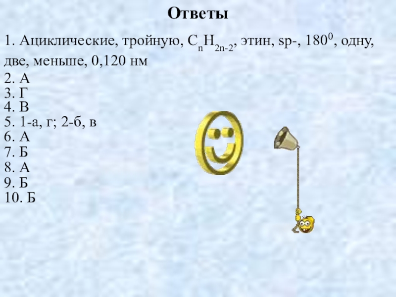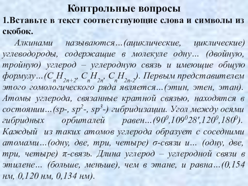1. Ациклические, тройную, CnH2n-2, этин, sp-, 1800, одну, две, меньше, 0,120