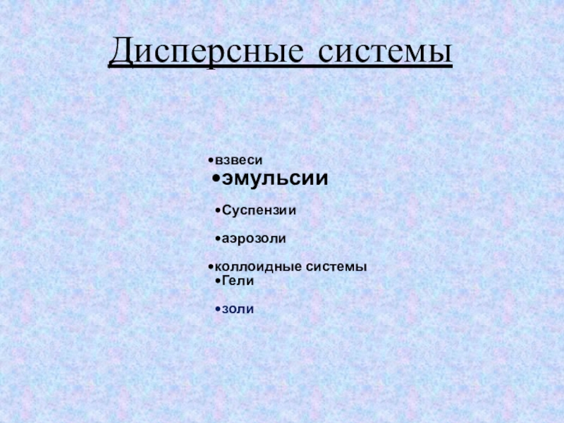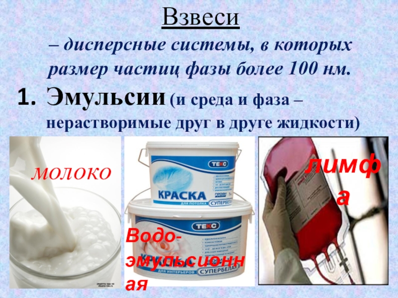 Эмульсии (и среда и фаза – нерастворимые друг в друге жидкости)