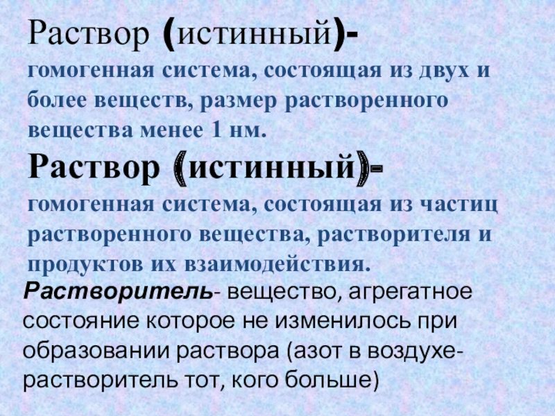 Растворитель- вещество, агрегатное состояние которое не изменилось при образовании раствора (азот в воздухе- растворитель тот, кого больше)