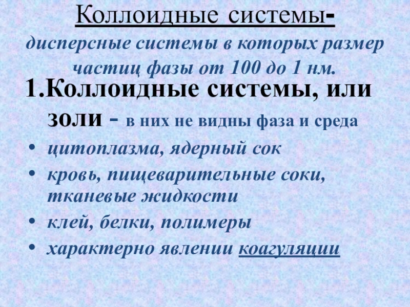 1.Коллоидные системы, или золи - в них не видны фаза и среда