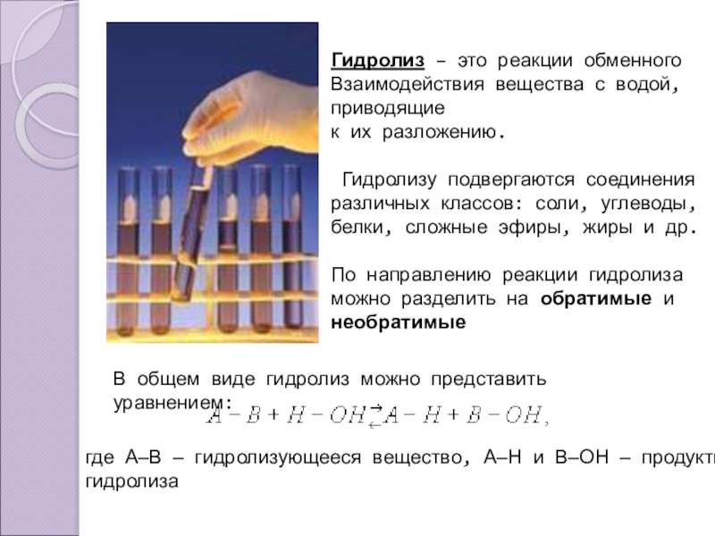 где А—В — гидролизующееся вещество, А—Н и В—ОН — продукты гидролиза