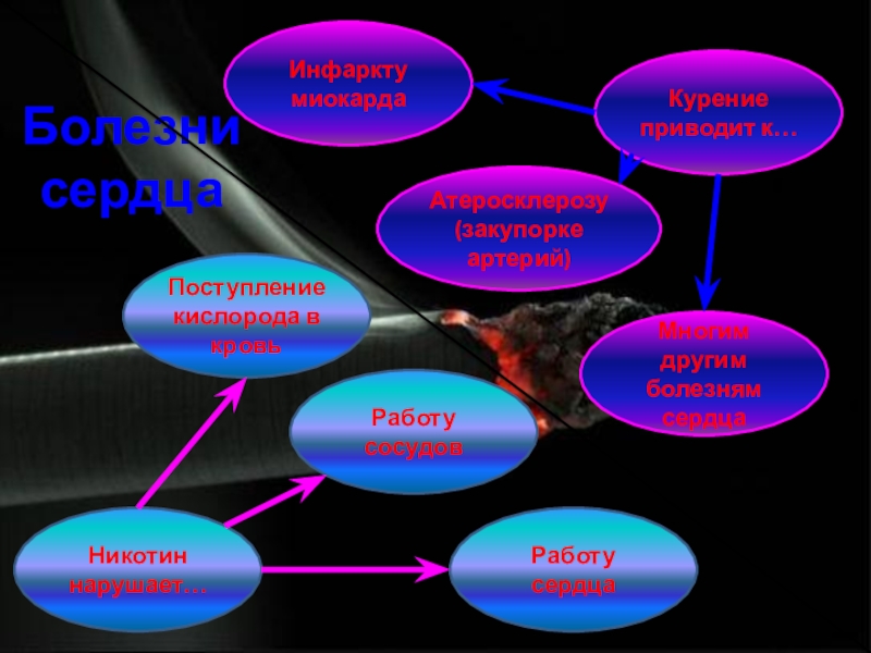 Курение наносит вред сердечнососудистой системе и органам дыхания. Под влиянием никотина происходит спазм сосудов и ухудшение кровотока в теле. Далее это ведет к инфаркту.
