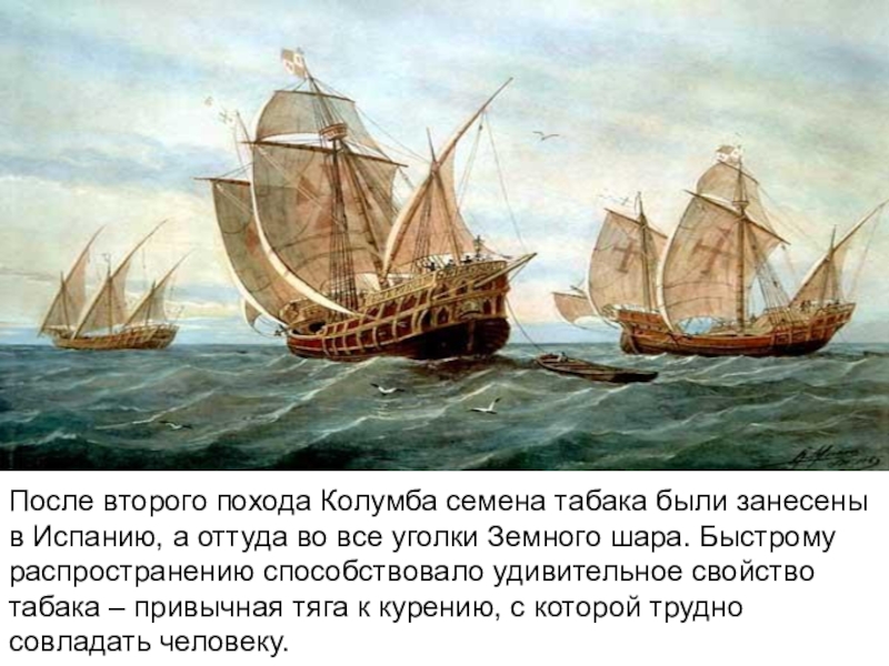Слайд 4После второго похода Колумба семена табака были занесены в Испанию, а
