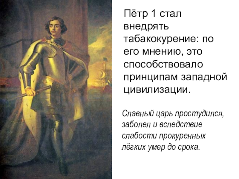 Слайд 7Пётр 1 стал внедрять табакокурение: по его мнению, это способствовало принципам