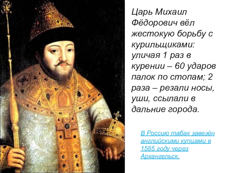 Слайд 6Царь Михаил Фёдорович вёл жестокую борьбу с курильщиками: уличая 1 раз
