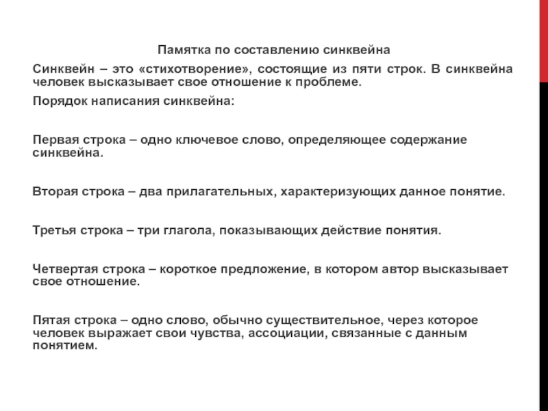 Пятая строка – одно слово, обычно существительное, через которое человек выражает свои чувства, ассоциации, связанные с данным понятием.