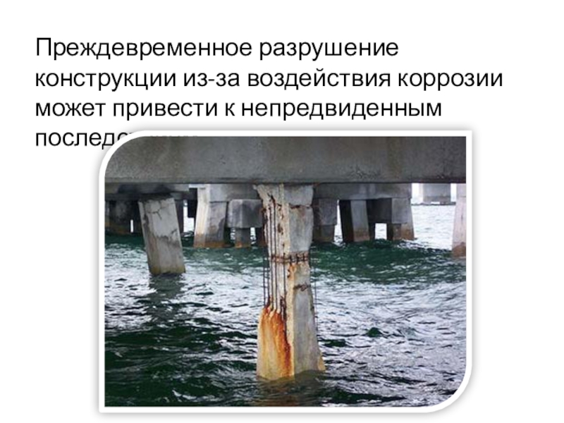 Слайд 9Преждевременное разрушение конструкции из-за воздействия коррозии может привести к непредвиденным последствиям.