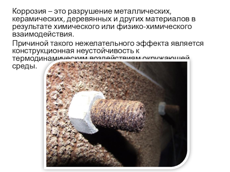 Слайд 2Коррозия – это разрушение металлических, керамических, деревянных и других материалов в