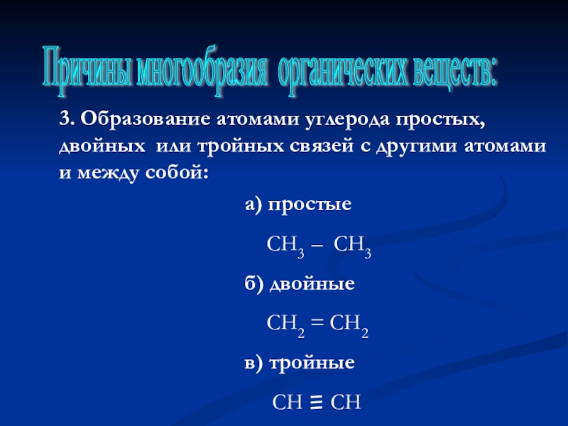 3. Образование атомами углерода простых, двойных или тройных связей с другими атомами и между собой: