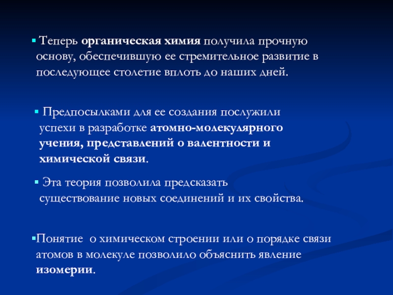 Предпосылками для ее создания послужили успехи в разработке атомно-молекулярного учения, представлений о валентности и химической связи.
