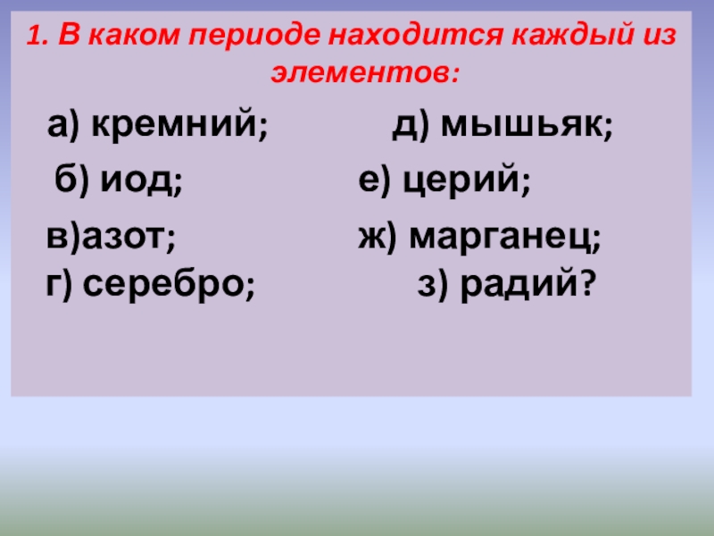 Слайд 21. В каком периоде находится каждый из элементов: