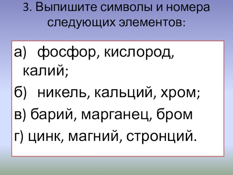 Слайд 43. Выпишите символы и номера следующих элементов: