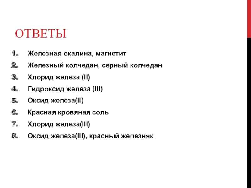 ОтветыЖелезная окалина, магнетитЖелезный колчедан, серный колчеданХлорид железа (II)Гидроксид железа (III)Оксид железа(II)Красная кровяная сольХлорид железа(III)Оксид железа(III), красный железняк