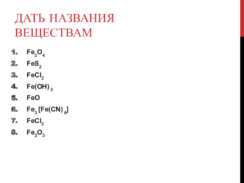 Дать названия веществамFe3O4FeS2FeCl2Fe(OH) 3FeOFe3 [Fe(CN) 6]FeCl3Fe2O3