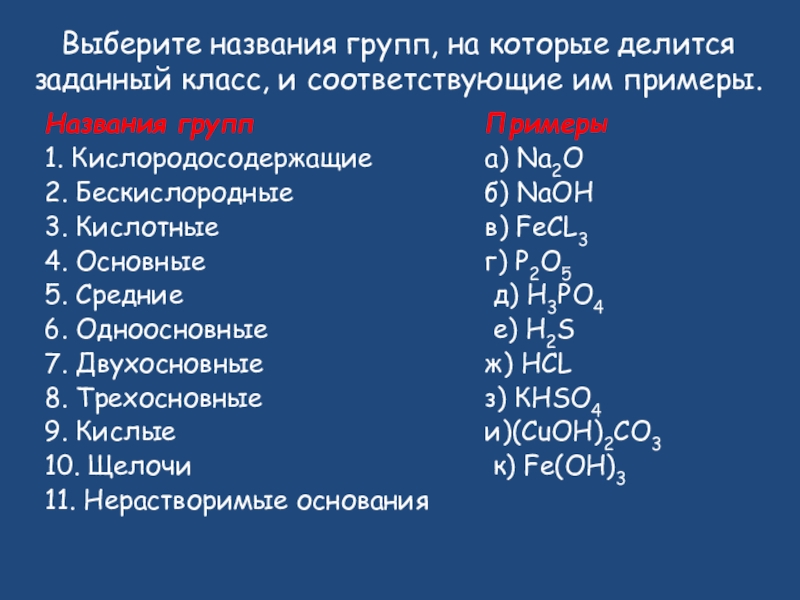 Выберите названия групп, на которые делится заданный класс, и соответствующие им