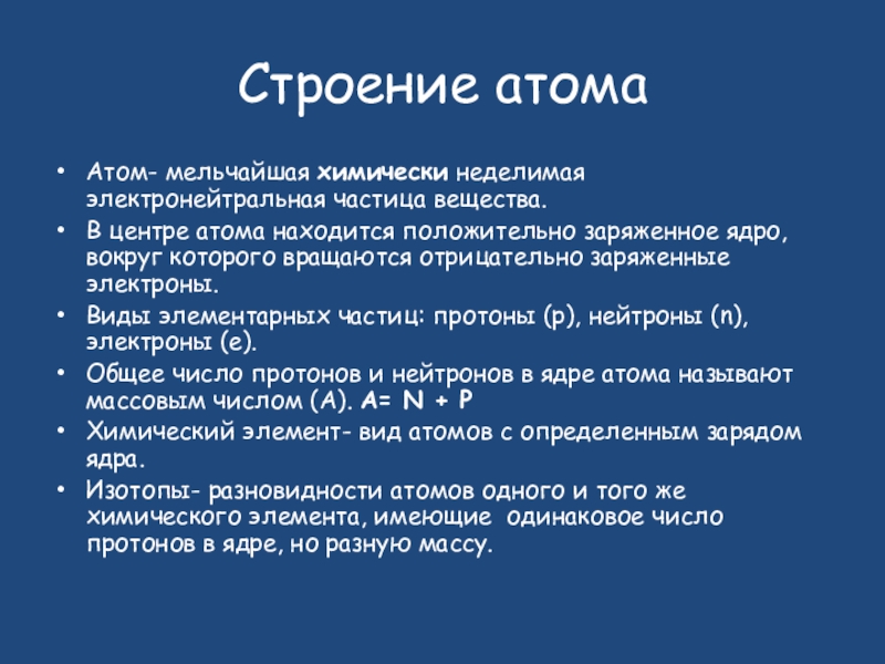 Атом- мельчайшая химически неделимая электронейтральная частица вещества.