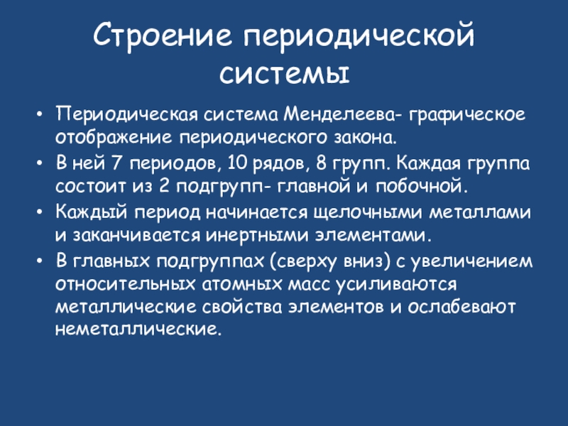 периодов, 10 рядов, 8 групп. Каждая группа состоит из 2 подгрупп- главной и побочной.