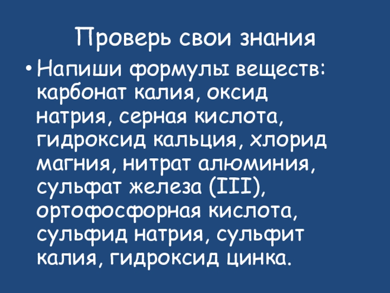 гидроксид кальция, хлорид магния, нитрат алюминия, сульфат железа (III),ортофосфорная кислота, сульфид натрия, сульфит калия, гидроксид цинка.