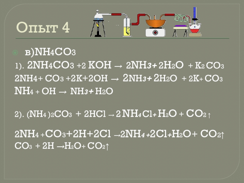 1). 2NH4CO3 +2 KOH → 2NH3+ 2H2O + K2