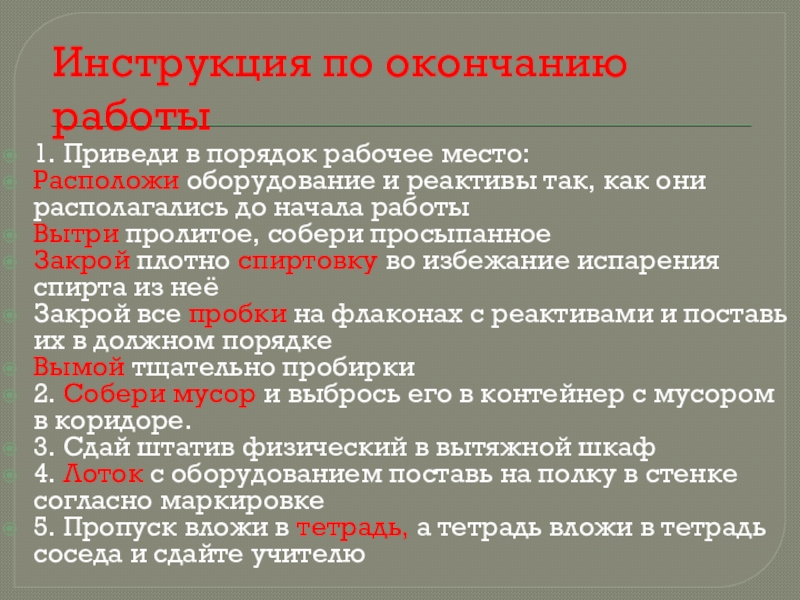 Закрой все пробки на флаконах с реактивами и поставь их в должном порядке