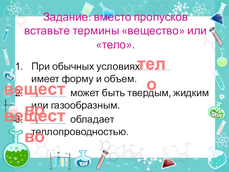 Задание 4. Дополните последовательность: название вещества – свойство вещества – применение вещества.