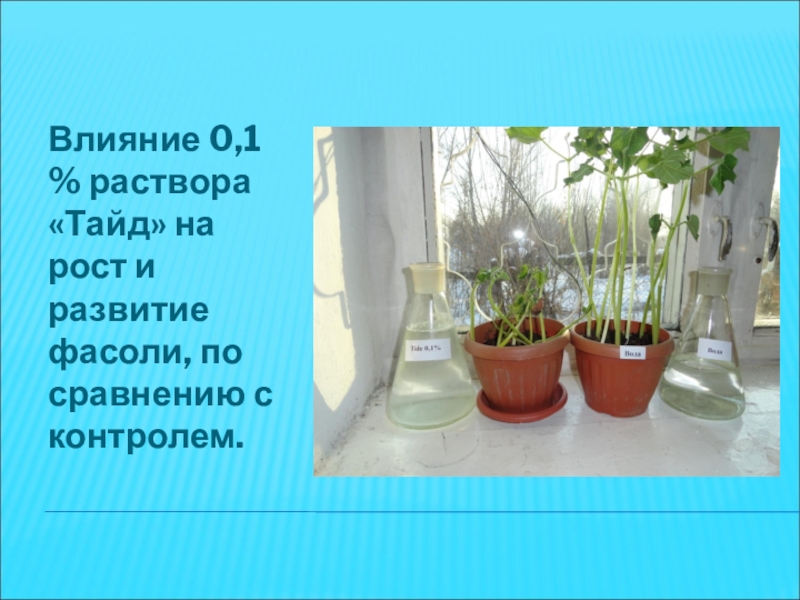 Слайд 31Влияние 0,1 % раствора «Тайд» на рост и развитие фасоли, по