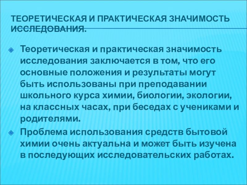 том, что его основные положения и результаты могут быть использованы при преподавании школьного курса химии, биологии, экологии, на классных часах, при беседах с учениками и родителями.