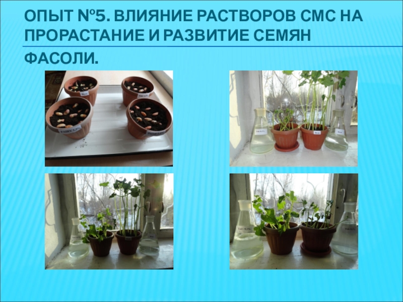 Слайд 29ОПЫТ №5. ВЛИЯНИЕ РАСТВОРОВ СМС НА ПРОРАСТАНИЕ И РАЗВИТИЕ СЕМЯН ФАСОЛИ.