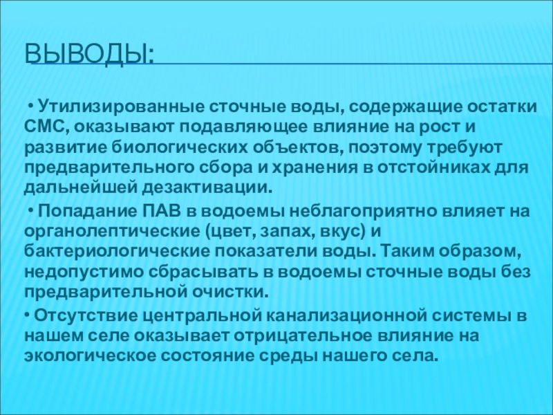 • Утилизированные сточные воды, содержащие остатки СМС, оказывают подавляющее влияние