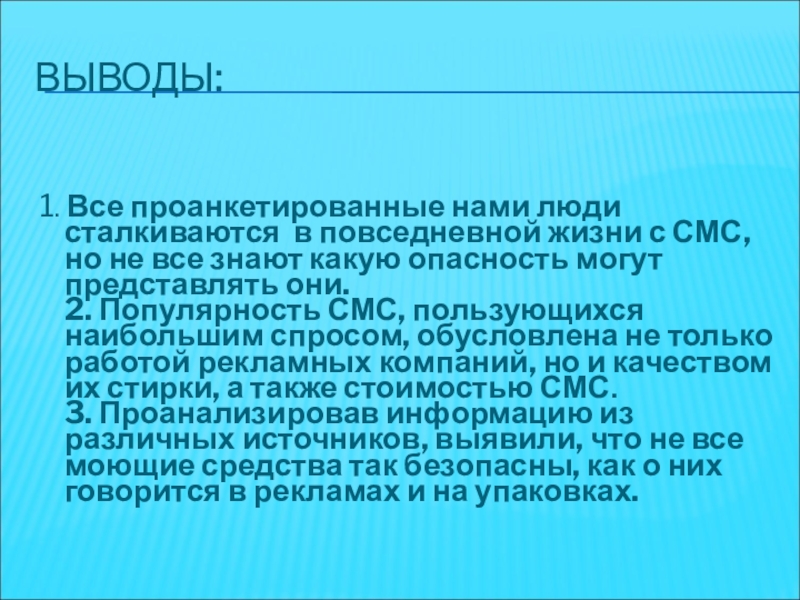 2. Популярность СМС, пользующихся наибольшим спросом, обусловлена не только работой рекламных компаний, но и качеством их стирки, а также стоимостью СМС. 3. Проанализировав информацию из различных источников, выявили, что не все моющие средства так безопасны, как о них говорится в рекламах и на упаковках.