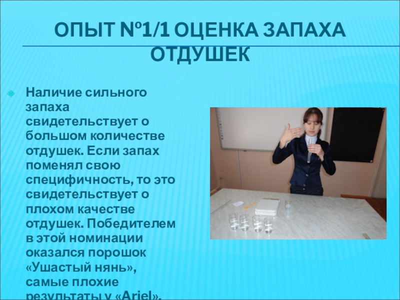 Слайд 20ОПЫТ №1/1 ОЦЕНКА ЗАПАХА ОТДУШЕК
