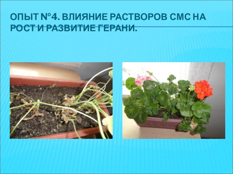 Слайд 28ОПЫТ №4. ВЛИЯНИЕ РАСТВОРОВ СМС НА РОСТ И РАЗВИТИЕ ГЕРАНИ.