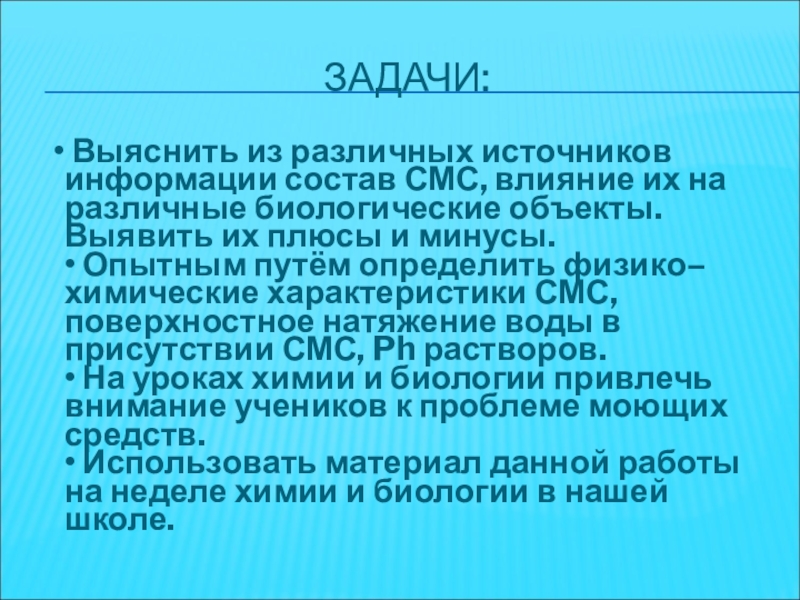 Расширить представление учащихся и их родителей о химическом составе СМС, о вредных их компонентах.