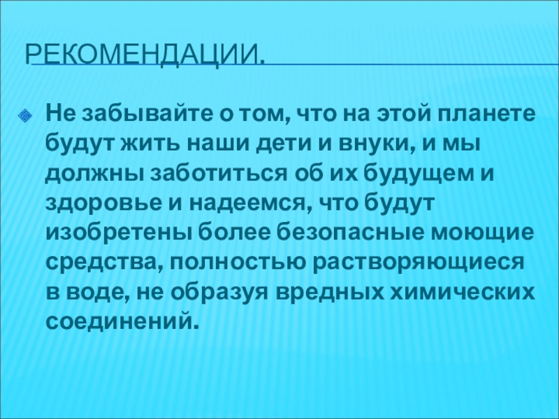 дети и внуки, и мы должны заботиться об их будущем и здоровье и надеемся, что будут изобретены более безопасные моющие средства, полностью растворяющиеся в воде, не образуя вредных химических соединений.