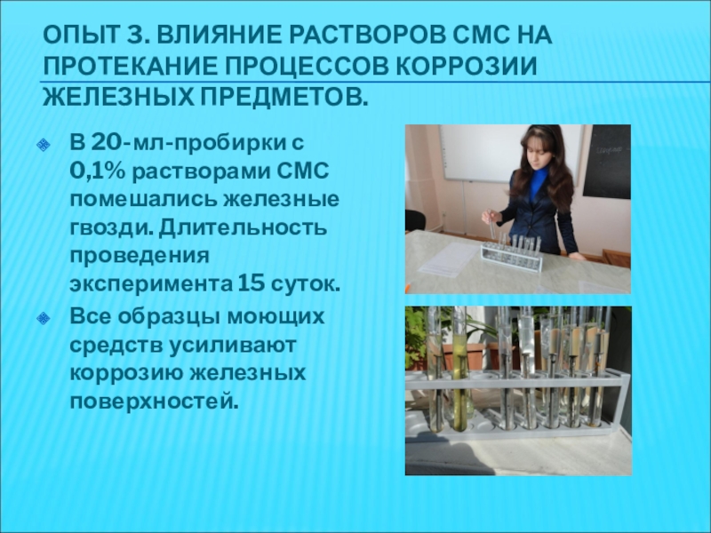 Слайд 26ОПЫТ 3. ВЛИЯНИЕ РАСТВОРОВ СМС НА ПРОТЕКАНИЕ ПРОЦЕССОВ КОРРОЗИИ ЖЕЛЕЗНЫХ ПРЕДМЕТОВ.