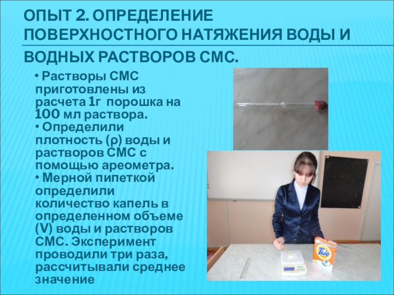 Слайд 23ОПЫТ 2. ОПРЕДЕЛЕНИЕ ПОВЕРХНОСТНОГО НАТЯЖЕНИЯ ВОДЫ И ВОДНЫХ РАСТВОРОВ СМС.