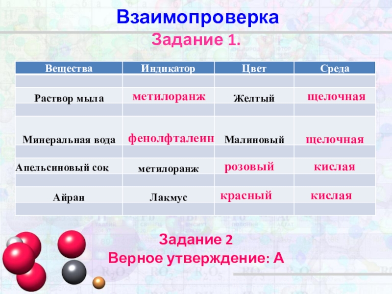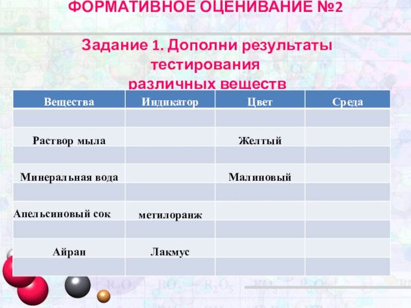 Слайд 14ФОРМАТИВНОЕ ОЦЕНИВАНИЕ №2 Задание 1. Дополни результаты тестирования различных веществ
