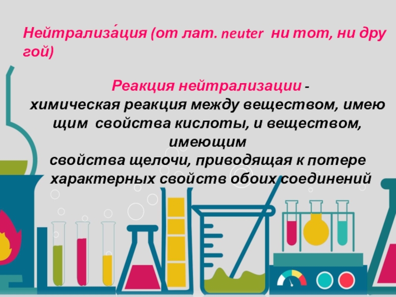 Нейтрализа́ция (от лат. neuter  ни тот, ни другой)  Реакция нейтрализации -   химическая реакция между веществом, имеющим свойства кислоты, и веществом,  имеющим свойства щелочи, приводящая к потере  характерных свойств обоих соединений