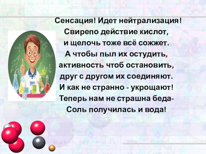 Сенсация! Идет нейтрализация!Свирепо действие кислот,и щелочь тоже всё сожжет.А чтобы пыл их остудить,активность чтоб остановить,друг с