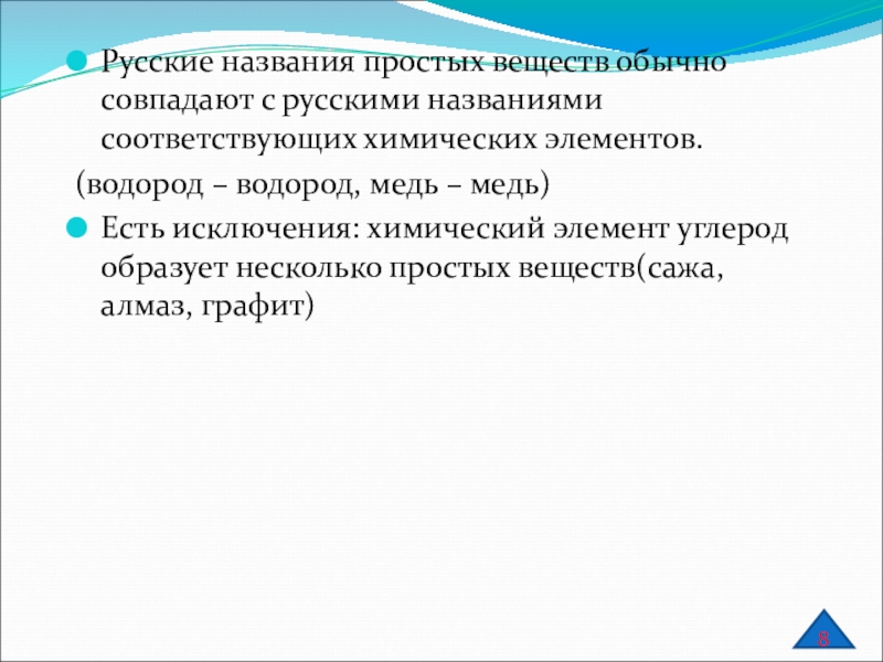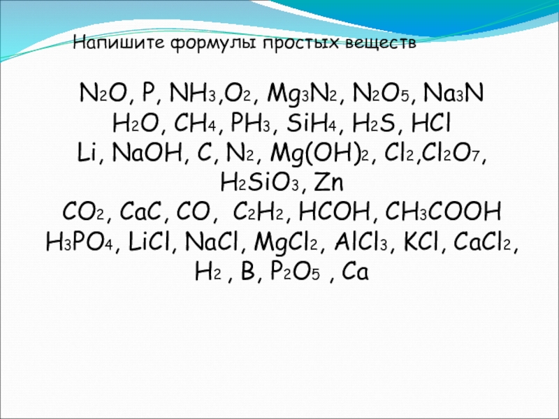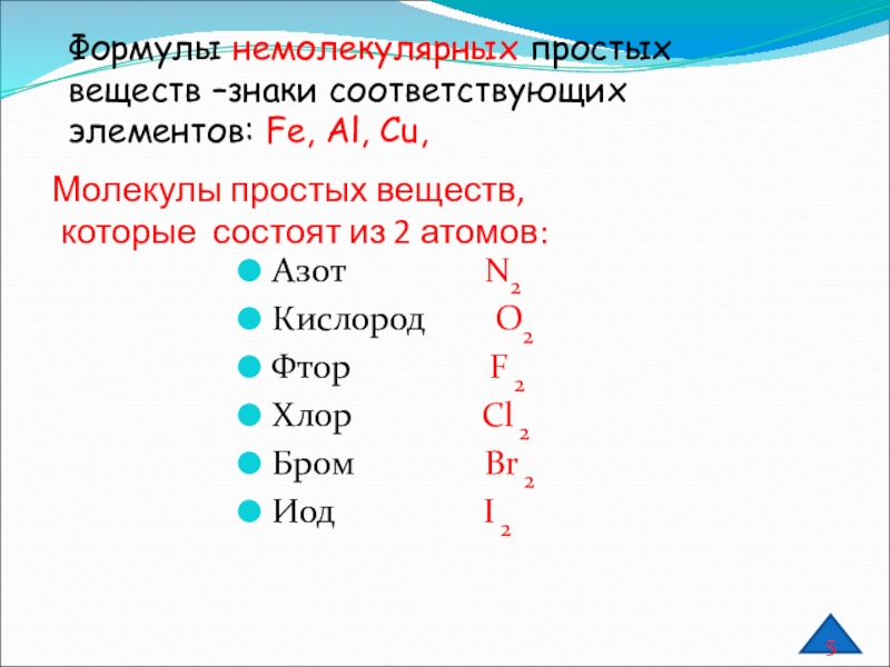 Формулы немолекулярных простых веществ –знаки соответствующих элементов: Fe, Al, Cu,