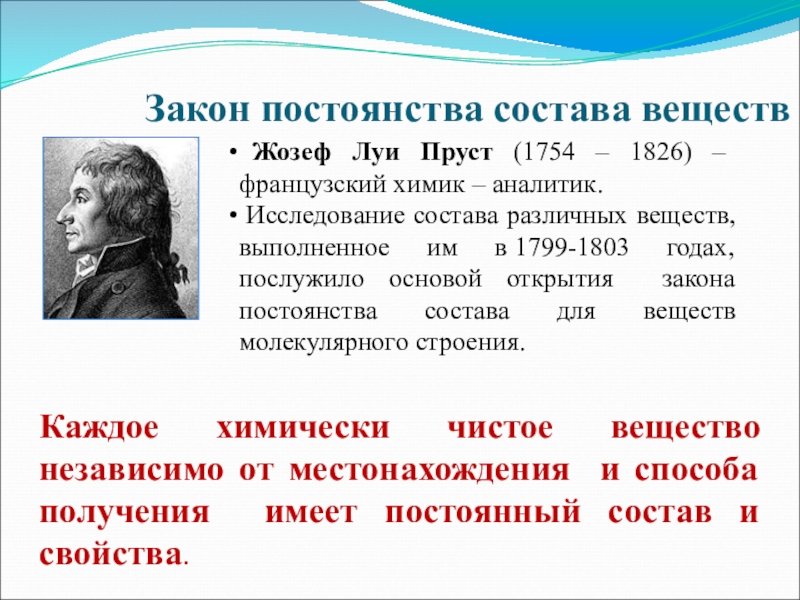 Каждое химически чистое вещество независимо от местонахождения и способа получения имеет постоянный состав и свойства.