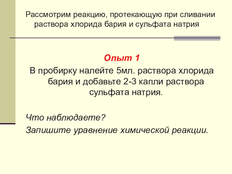 Рассмотрим реакцию, протекающую при сливании раствора хлорида бария и сульфата натрияОпыт 1В пробирку налейте 5мл. раствора хлорида