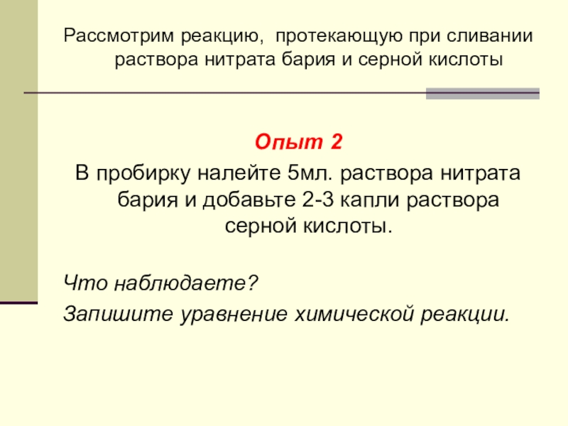 Рассмотрим реакцию, протекающую при сливании раствора нитрата бария и серной кислотыОпыт 2В пробирку налейте 5мл. раствора нитрата